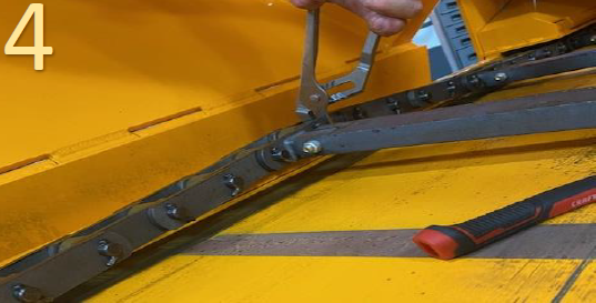 4. If the conveyor chains have more than the desired distance turn the conveyor bolts clockwise ¼ turn at a time using a 15/16 socket, extension, and wrench. (Do not use impact drill)