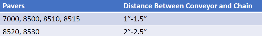 2. Please reference the table below. If the conveyor has more or less than the desired slack please adjust the conveyor accordingly. To see how much slack is in the conveyor lift the chain in the center of the conveyor at four places using channel locks with MINIMAL lift force. If it does not meet the desired requirements please adjust accordingly.