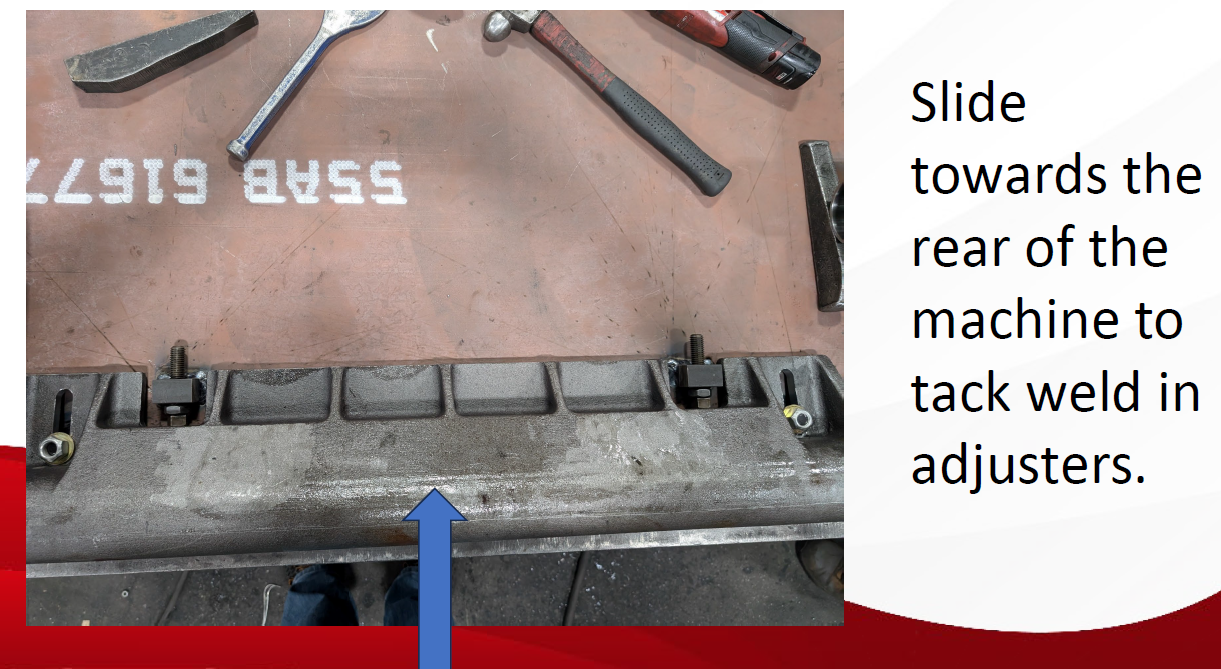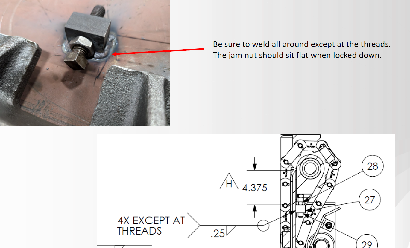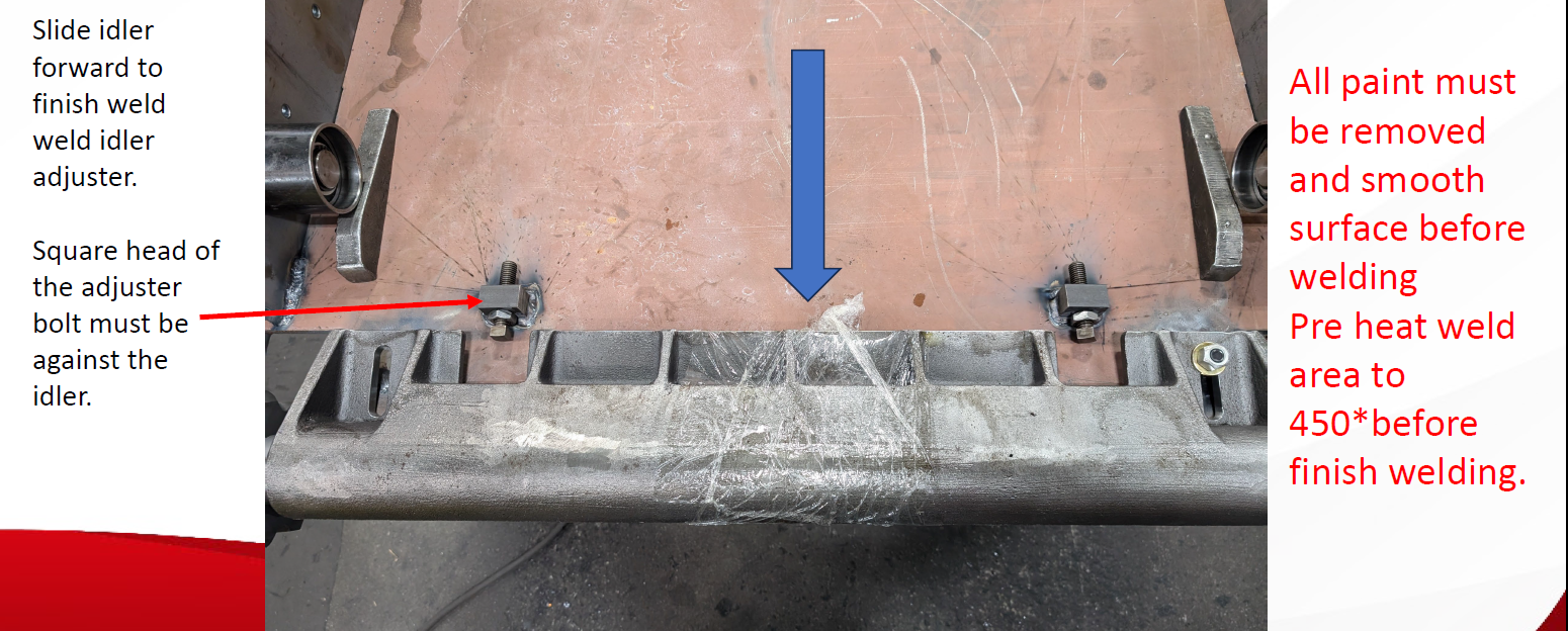 • Weld in new adjusters with the square head of the jack bolt against the idler.