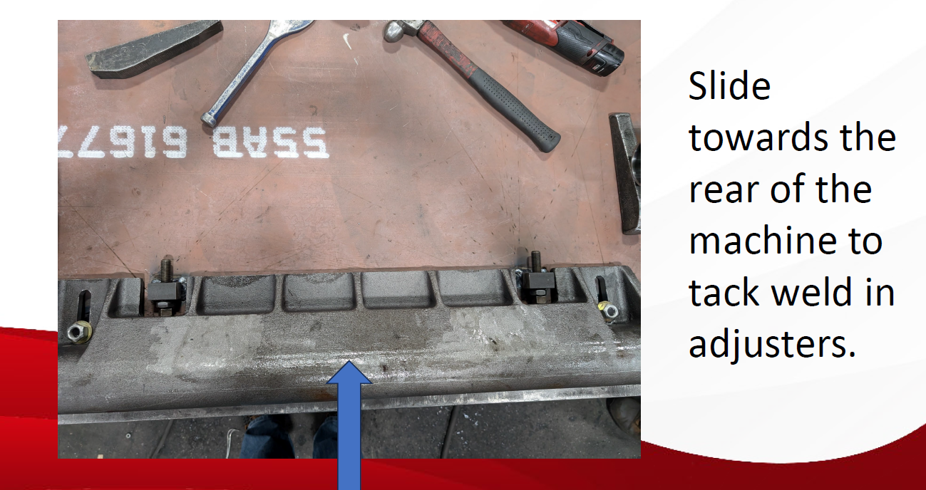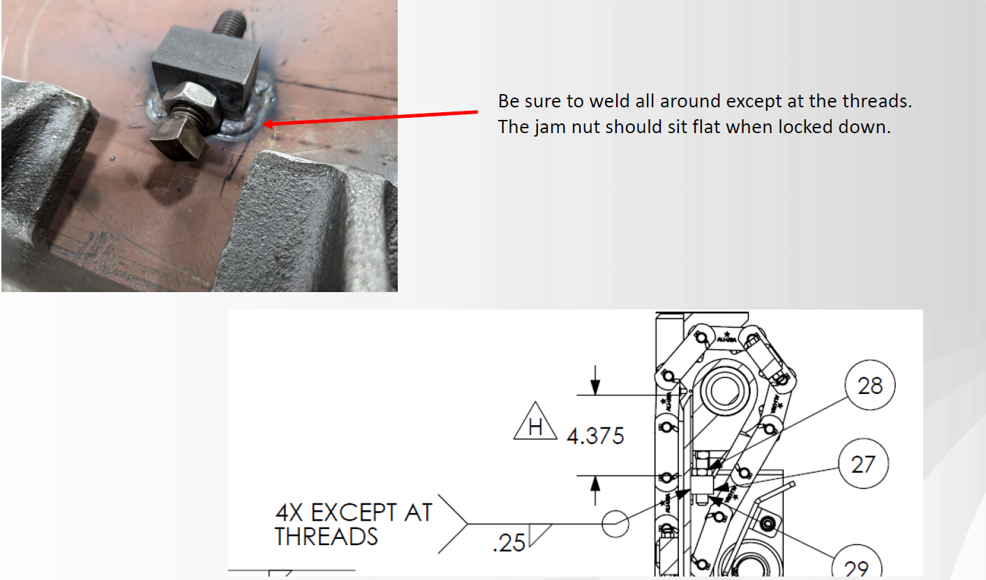 • Weld in new adjusters with the square head of the jack bolt against the idler.