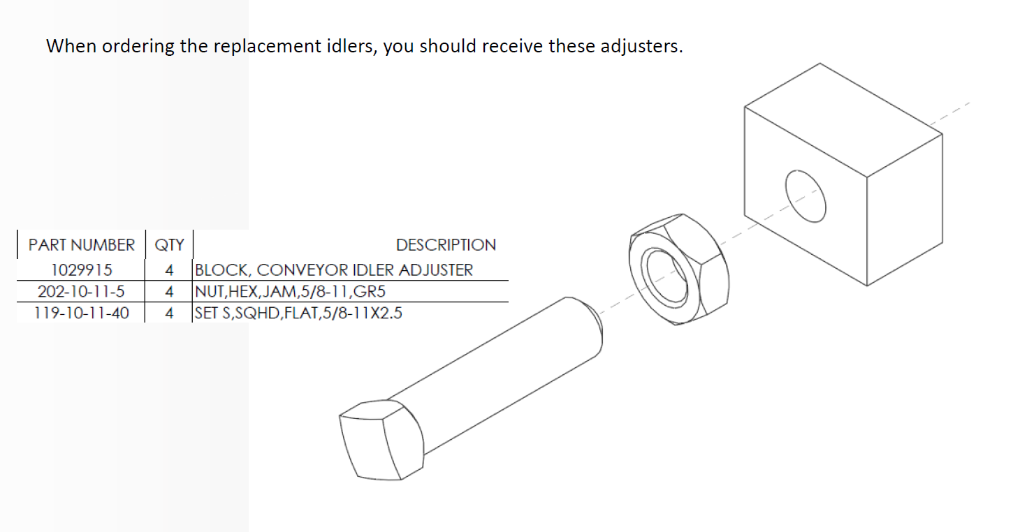 • Tack adjusters in position (square head goes against the idler) then slide idlers to the front.