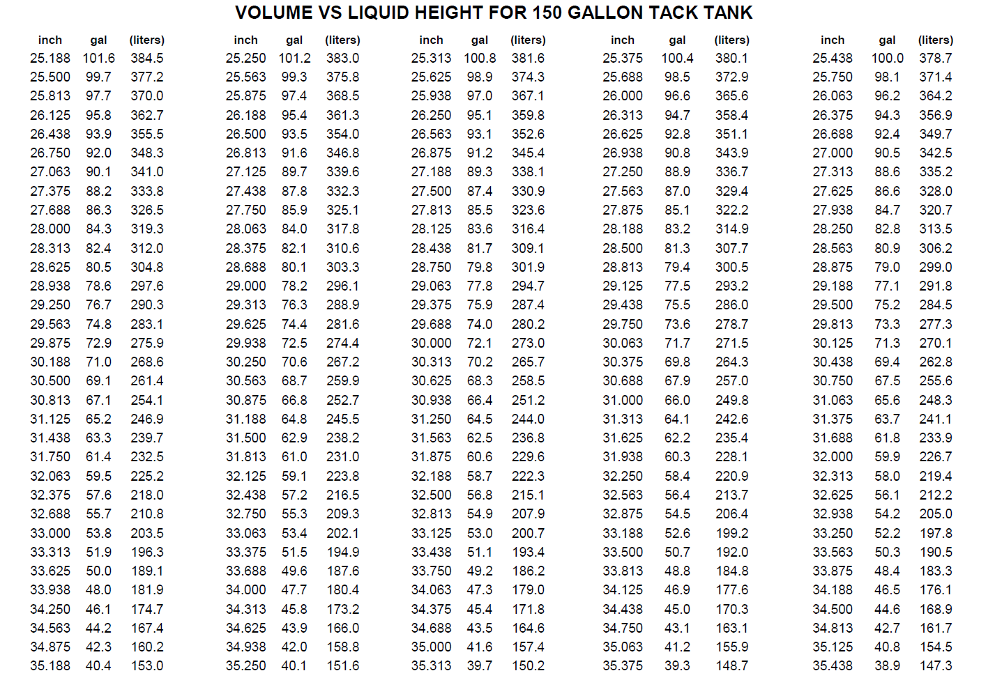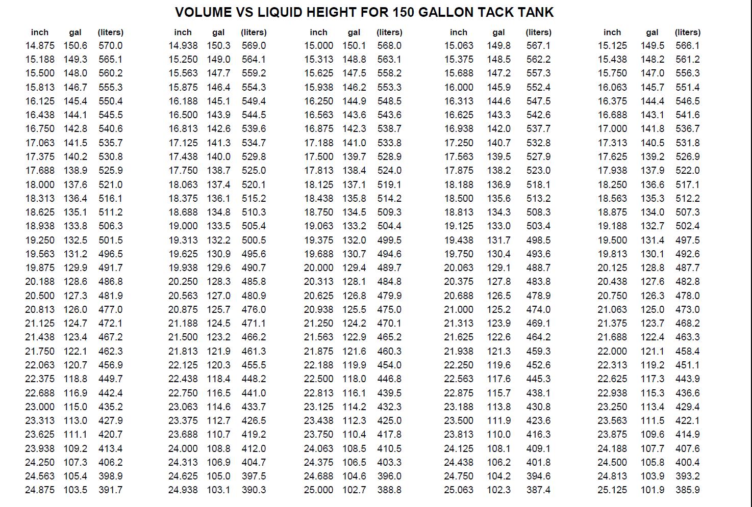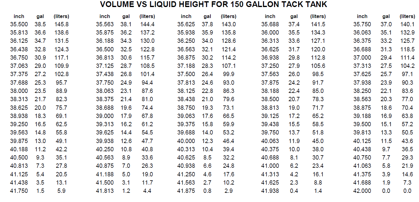 VOLUME VS LIQUID HEIGHT FOR 150 GALLON TACK TANK Have more questions? Submit a request 0 Comments Article is closed for comments.