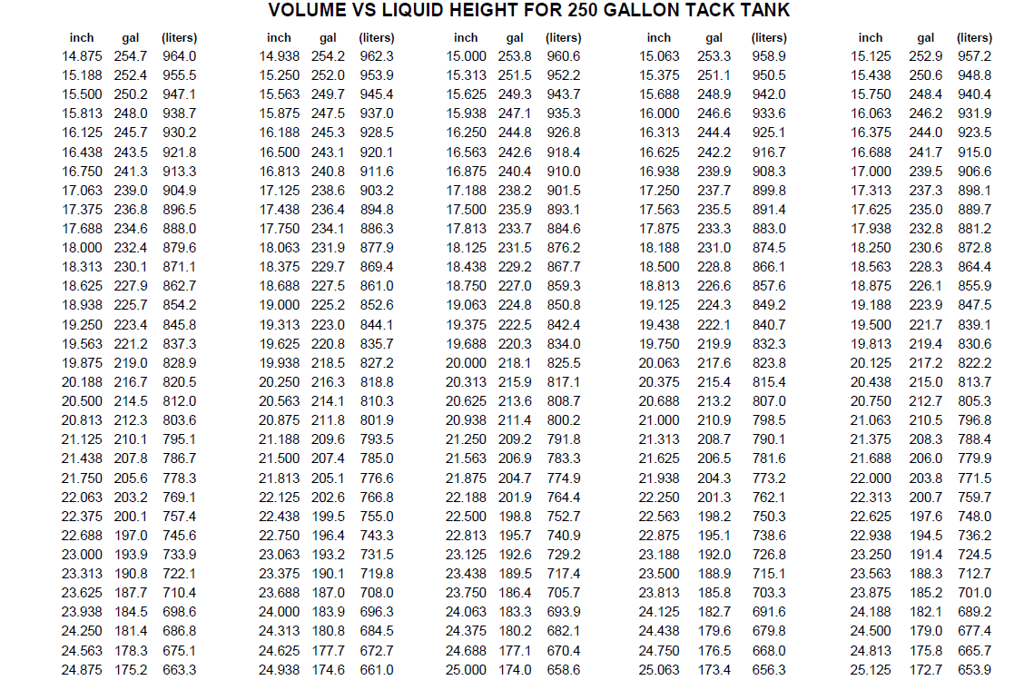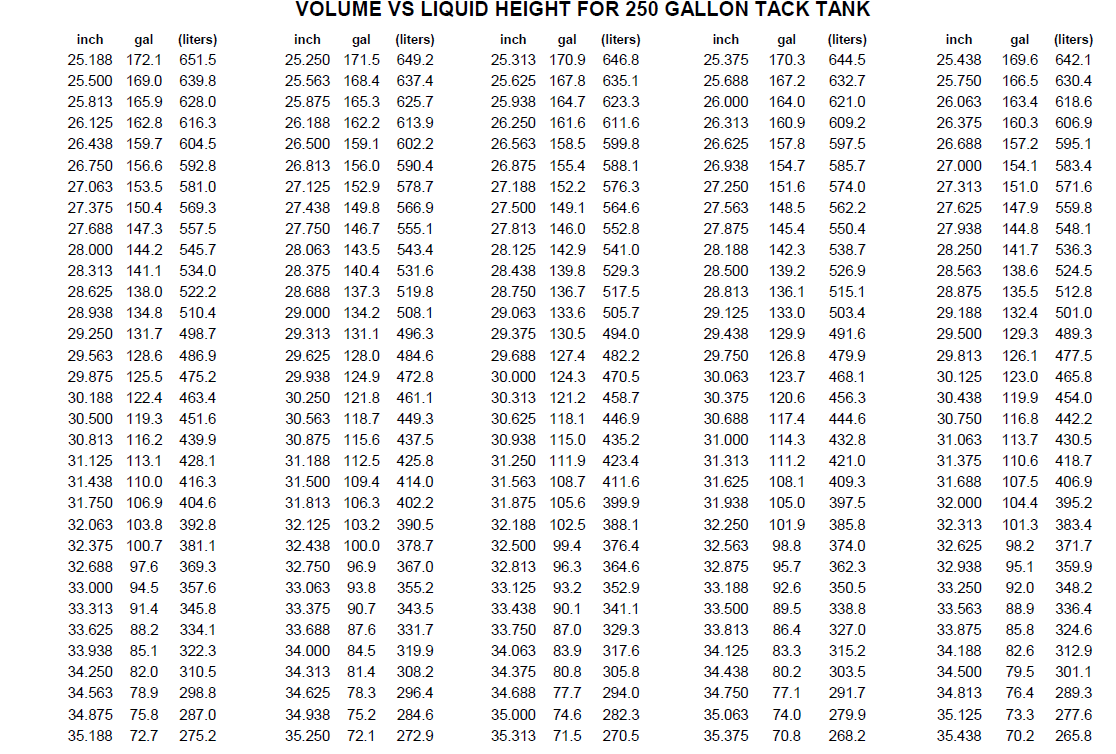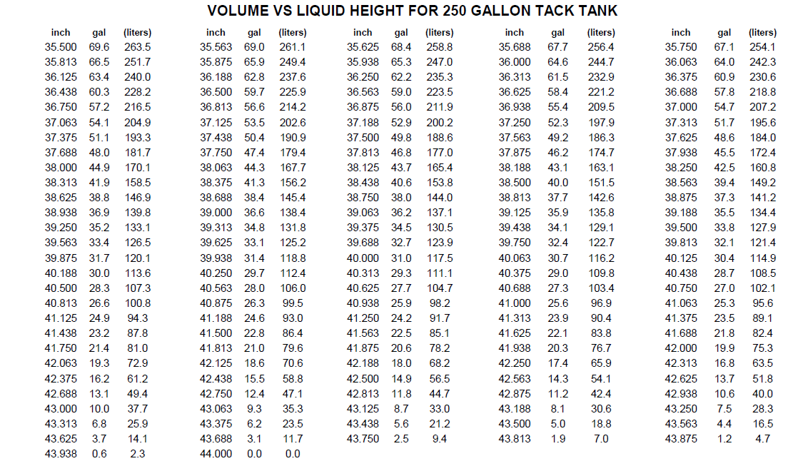 VOLUME VS LIQUID HEIGHT FOR 250 GALLON TACK TANK Have more questions? Submit a request 0 Comments Article is closed for comments.
