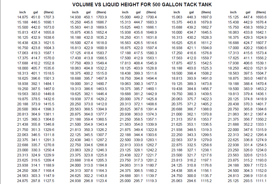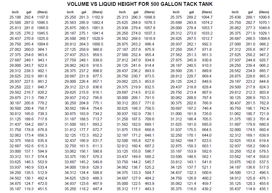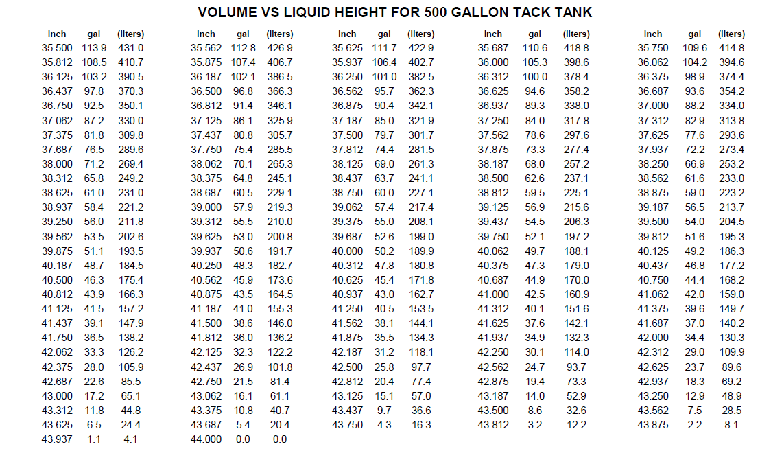 VOLUME VS LIQUID HEIGHT FOR 500 GALLON TACK TANK Have more questions? Submit a request 0 Comments Article is closed for comments.